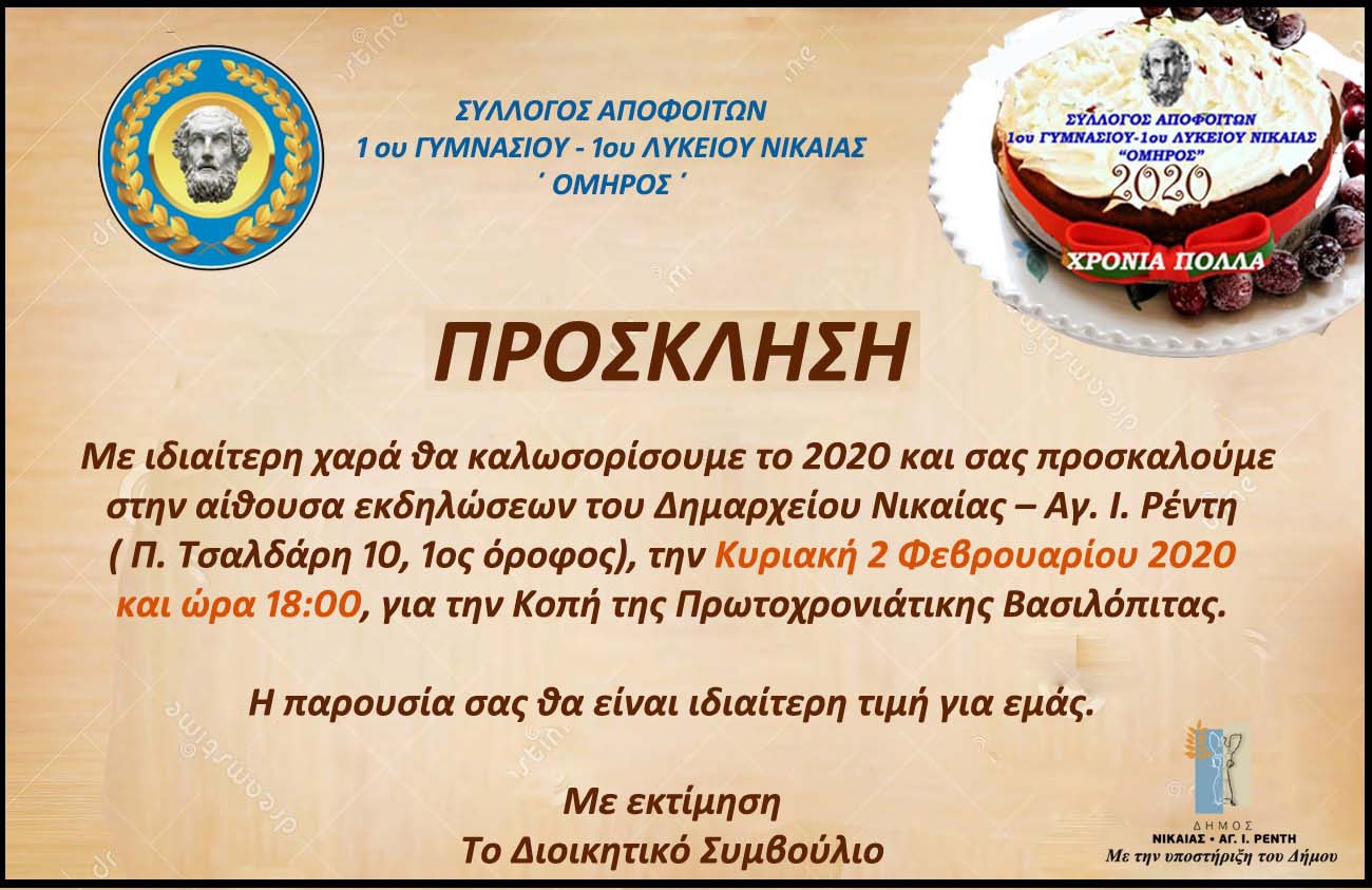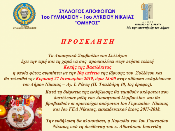 Την Κυριακή 27 Ιανουαρίου 2019 και ώρα 18:00, στην αίθουσα εκδηλώσεων του Δήμου Νίκαιας - Αγ. Ι. Ρέντη (Π. Τσαλδάρη 10, 1οςόροφος) ο Σύλλογος θα προβεί στην ετήσια τελετή Κοπής της Βασιλόπιτας η οποία φέτος συμπίπτει με την 10η επέτειο της ίδρυσής του.
