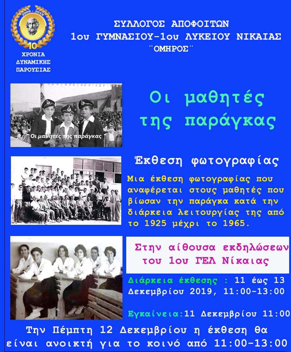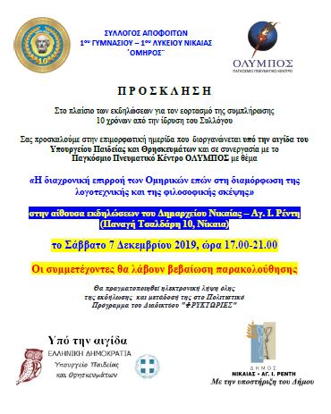 1ου Γυμνασίου – 1ου Λυκείου Νίκαιας ¨ΟΜΗΡΟΣ¨, διοργανώνεται, επιμορφωτική ημερίδα σε συνεργασία με το Σωματείο ΟΛΥΜΠΟΣ και υπό την αιγίδα του υπουργείου Παιδείας και Θρησκευμάτων το Σάββατο 7 Δεκεμβρίου 2019 (17.00-21.00) στο Δημαρχείο Νίκαιας – Αγ. Ι. Ρέντη (Π. Τσαλδάρη 10, Νίκαια).